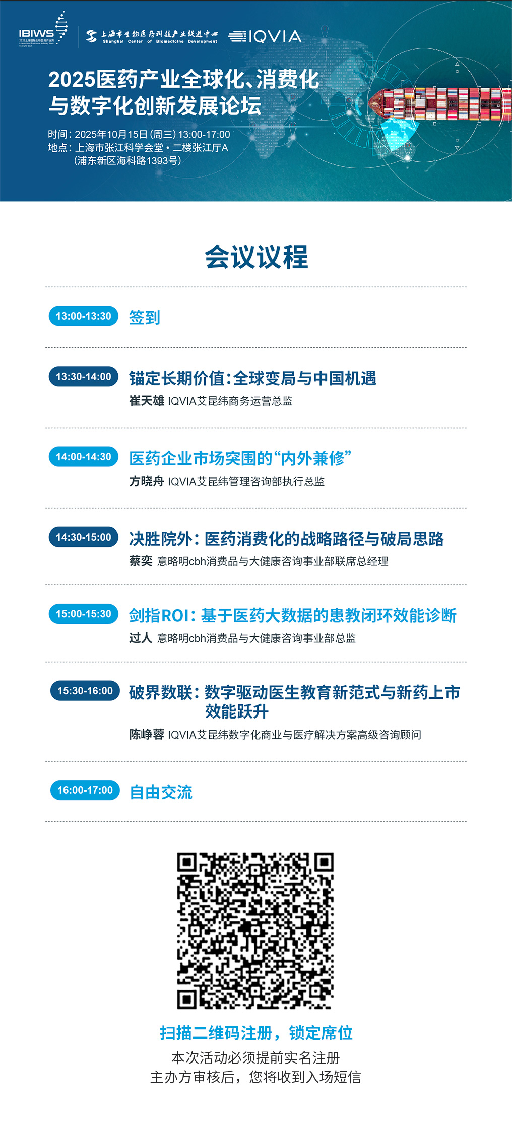 作为“2025上海国际生物医药产业周”的系列活动之一,由上海市生物医药科技产业促进中心指导、艾昆纬主办的“医药产业全球化、消费化与数字化创新发展论坛”将于10月15日隆重举行。意略明咨询专家将与医药企业和行业同仁共同探讨医药消费化战略路径,以及如何借助医药大数据提升患教效能,助力药企释放院外增长潜力。